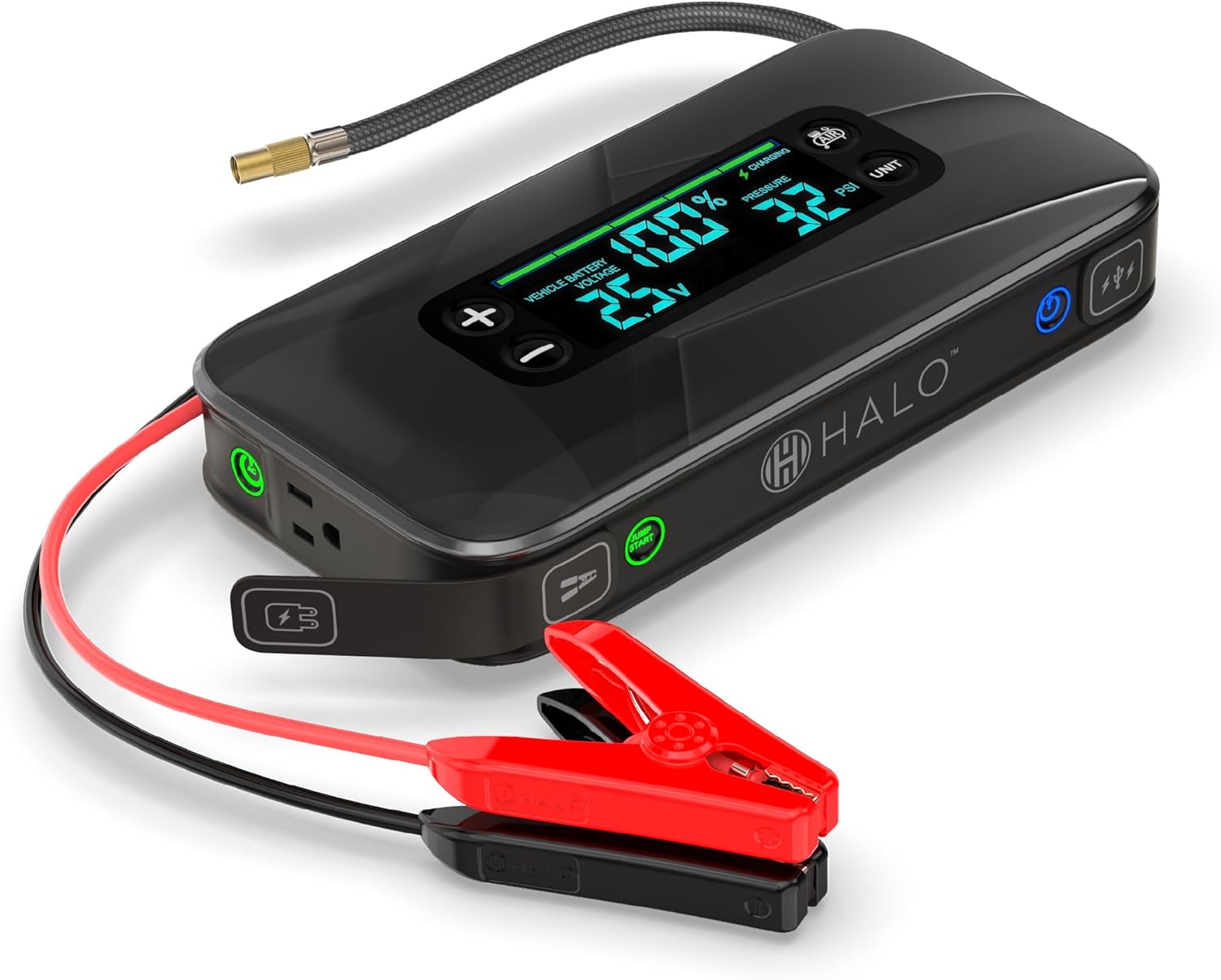 - 4-IN-1 DESIGN (JUMP + INFLATE + CHARGE + ILLUMINATE): The HALO Bolt Ultimate 3.0 offers four products in one. Not only will it jump start your vehicle, but it can inflate your tires, charge USB-powered devices and it has an integrated floodlight, so you’re better prepared for emergency roadside situations or power outages.