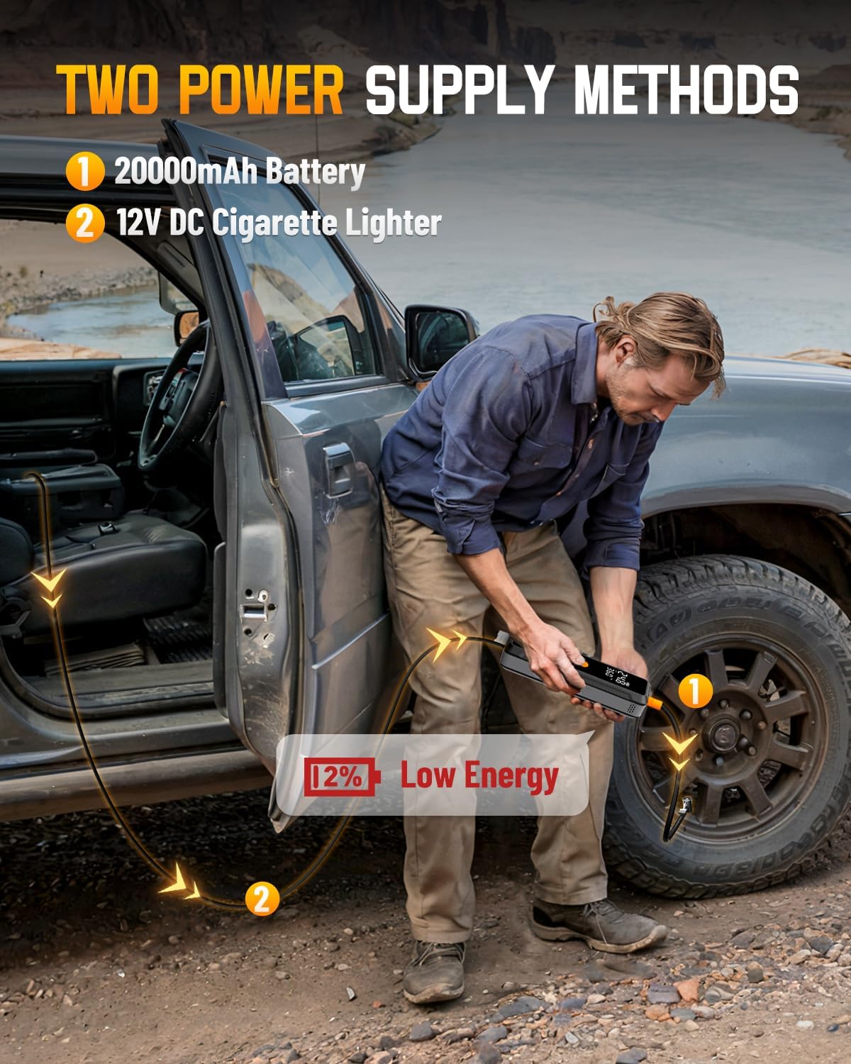 - 【Smart Control, Accurate Pressure】Set your target PSI and let the digital LED screen and auto shut-off take care of the rest. This smart air compressor prevents over-inflation and ensures safe, precise tire pressure every time.