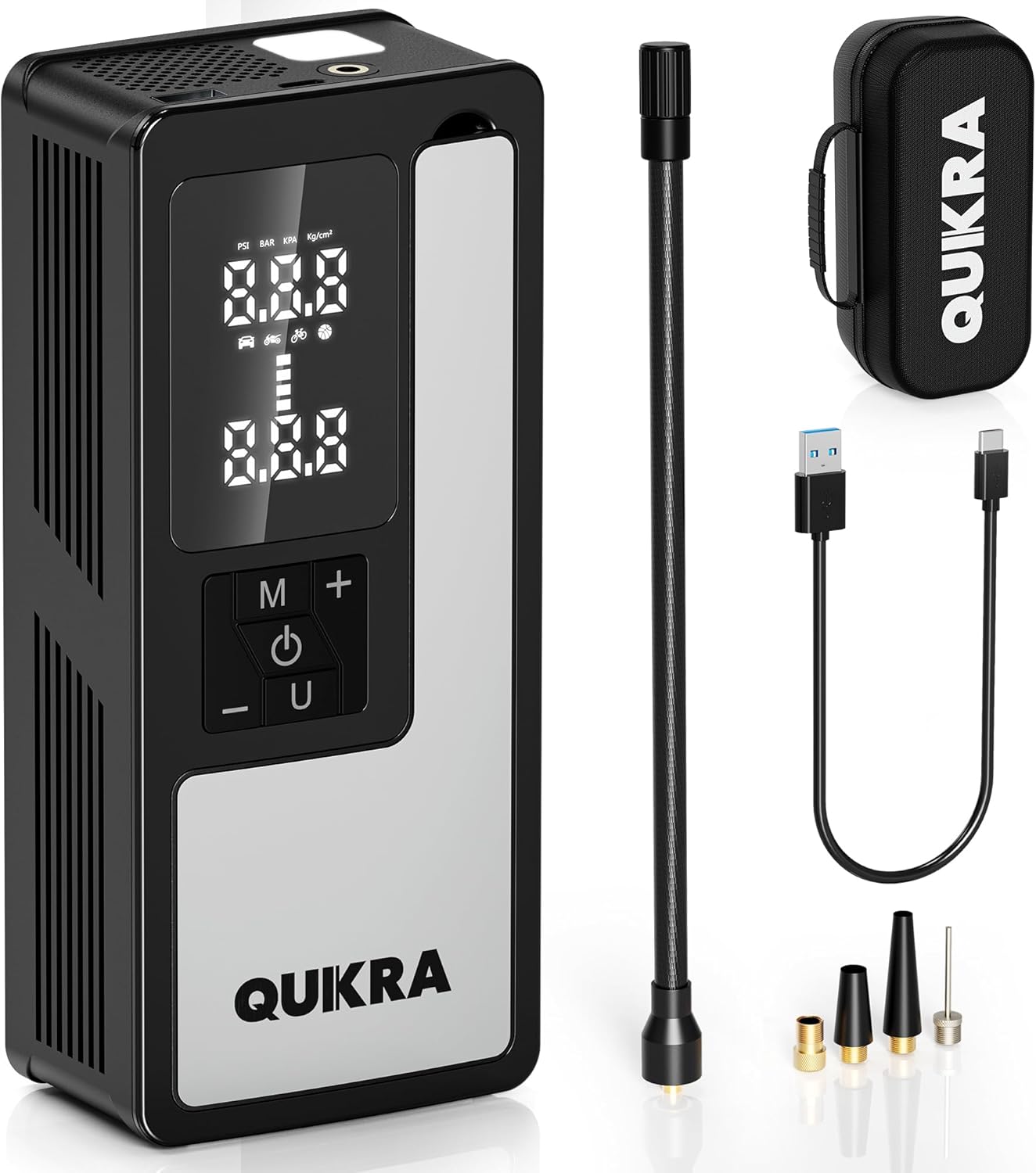 - [Package Include]: Smart portable tire inflator P009*1, storage bag*1, storage box*1, air hose*1, USB charging cable*1, long inflation nozzle*1, short inflation nozzle*1, french valve adapter*1, ball needle*1, service manual*1. If you have any questions, we are here to help you, QUIKRA devoted to provide premium product and customer-satisfying service