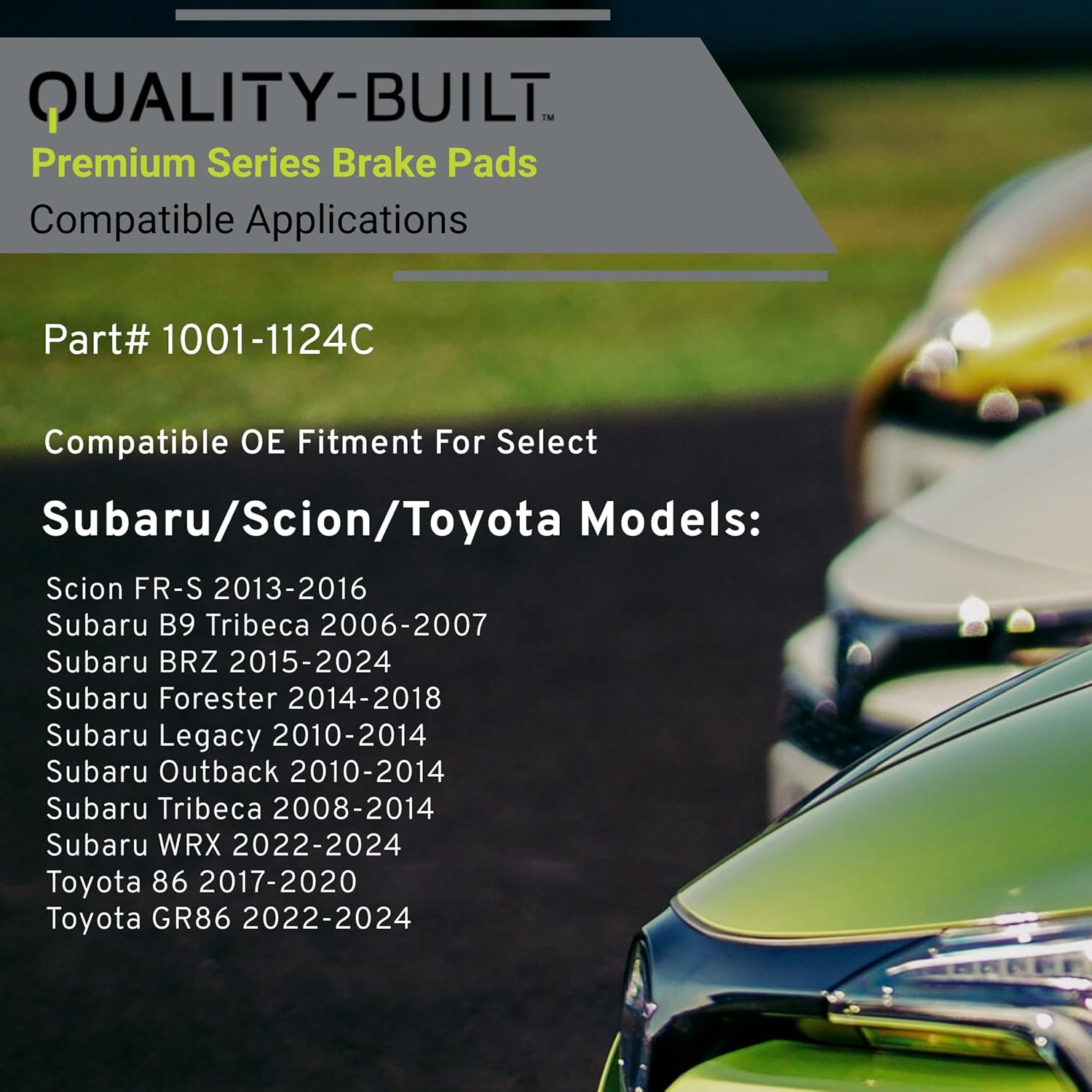 - VEHICLE FITMENT LIST: Scion FR-S 2016-2013, Subaru B9 Tribeca 2007-2006, BRZ 2020-2015, BRZ 2024-2022, Forester 2018-2014, Legacy 2014-2010, Outback 2014-2010, Tribeca 2014-2008, WRX 2024-2022, Toyota 86 2020-2017, GR86 2024-2022 (PART#1001-1124C)