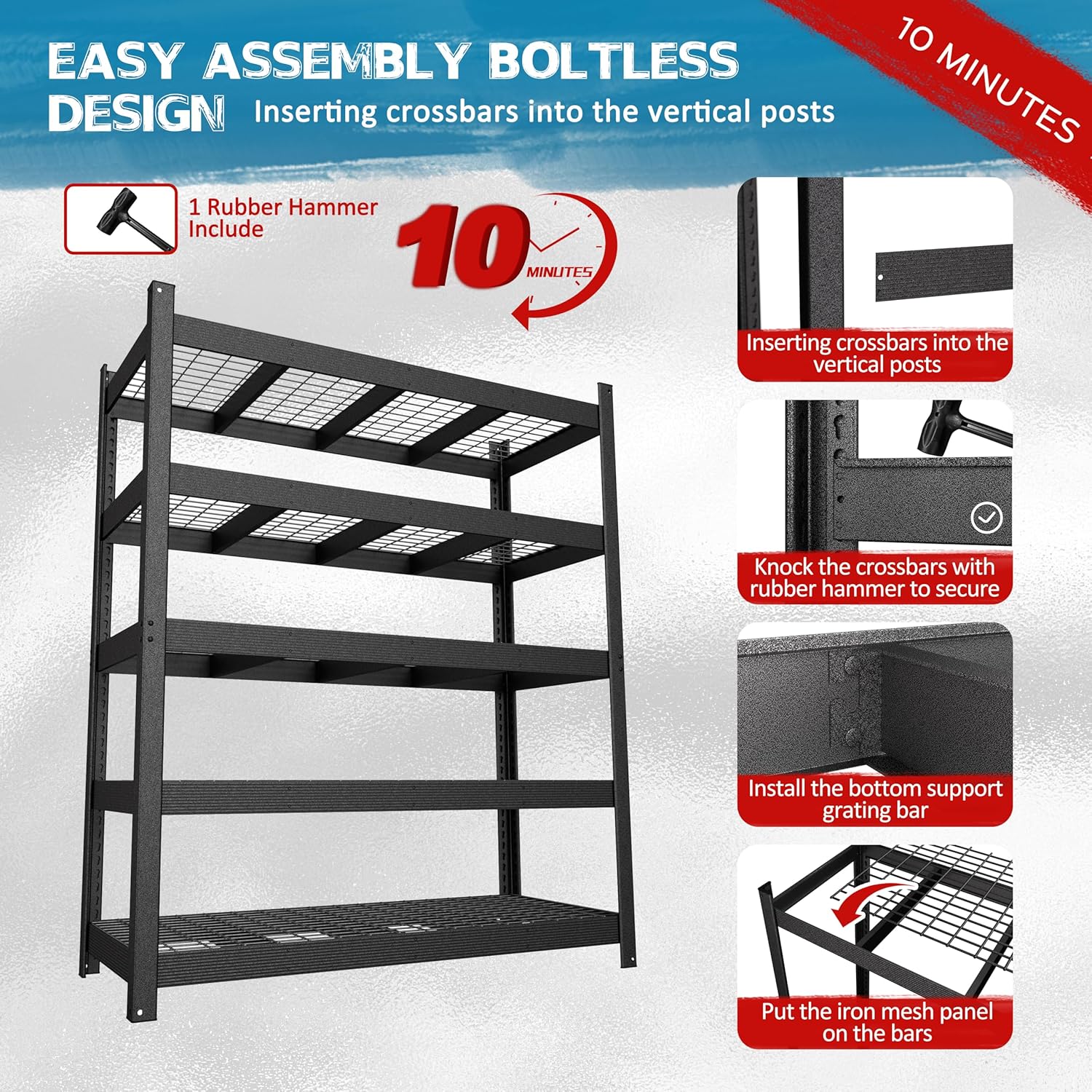 - EASY TO ASSEMBLE - This 5-layer black storage shelf comes with rubber mallets. Easy to install with a rubber mallet. You just need to Insert riveted crossbars into the vertical posts and Knock the crossbars with a rubber mallet to secure. It takes about 10 minutes to assemble these shelves.