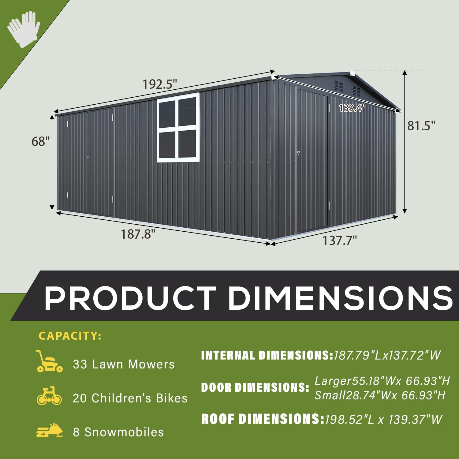 - Ample Storage Space: Boasting a total floor storage area of 192 Sq.Ft, our storage shed is among the larger options available, capable of accommodating a variety of outdoor vehicles, tools, or even serving as a dedicated outdoor workspace or deluxe pet room.